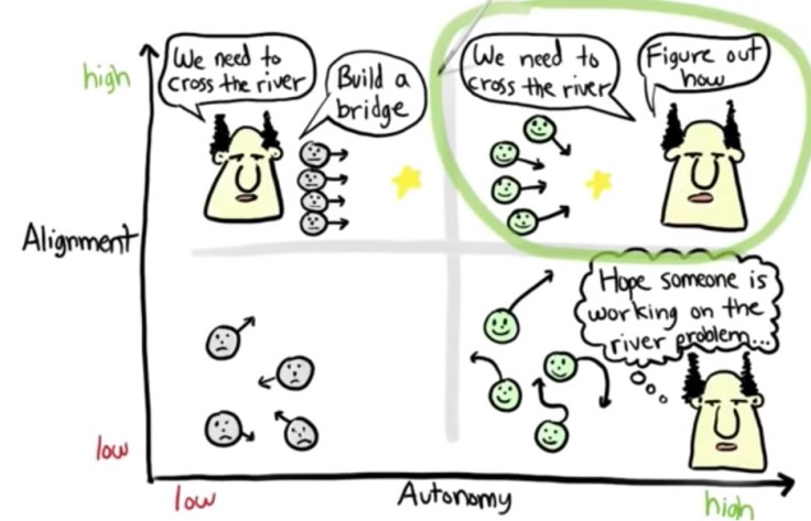 Reparem que, sem autonomia e sem alinhamento não há nem motivação, nem entregas. Porém, somente o alinhamento sem autonomia, gera desmotivação e ainda nos faz perder oportunidades de resolver o problema de outras formas. Em contrapartida, autonomia sem alinhamento gera desperdício, onde as pessoas produzem sem saber se o que estão fazendo é realmente o necessário para resolver os problemas. O ideal é termos um equilíbrio entre autonomia e alinhamento, onde temos o direcionamento, mas podemos decidir o melhor caminho a ser seguido. Reparem que na imagem essa situação é representada no quadrante superior direito, onde o personagem do líder expressa a necessidade de “atravessar o rio” deixando a equipe decidir como fazer isso. Faço apenas um adendo a esta figura que poderia trazer ainda mais significado, se o líder trouxesse o motivo da necessidade. Ilustro isso de uma forma bem lúdica, imagem que o motivo de precisarmos atravessar o rio é porque necessitamos de uma pedra que está do outro lado, porém, alguém do time conhece bem este lado do rio e sabe que podemos encontrar essa pedra sem precisar construir nada pra chegar do outro lado.